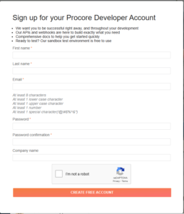 The first step is to create a Procore developer account. This allows you to use the sandbox for testing. This step will not be required for customers but only for beta testers who do not have Procore accounts.