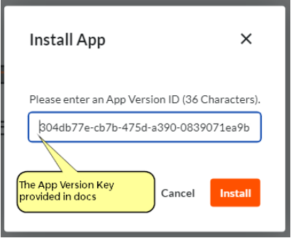 - Enter the 36-character ‘App Version ID’ provided to you by the custom App developer.