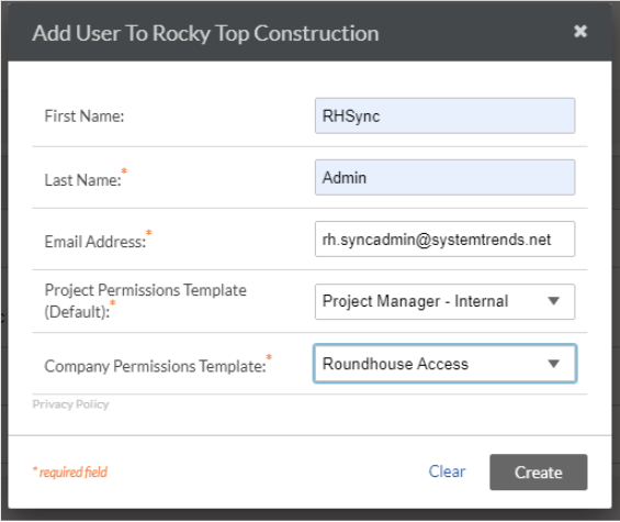 Fill out the form and give the SyncAdmin user Project Manager template and the company permissions template you created in previous steps.