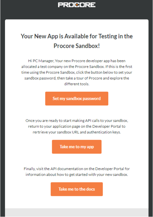 You are now done with the developer account setup. The rest of your interactions with Procore will be in the sandbox project. You will receive an email notification once the sandbox has been created.