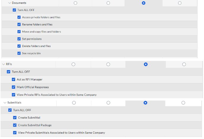There are two types of permissions templates: company permissions templates and project permissions templates. Company permissions templates are configured for Company level tools. Project permissions templates are configured for Project level tools. Both types can be created and edited in the company’s Permissions tool to fit various roles and teams in your company. See Manage Project Permissions Templates and Manage Company Permissions Templates.